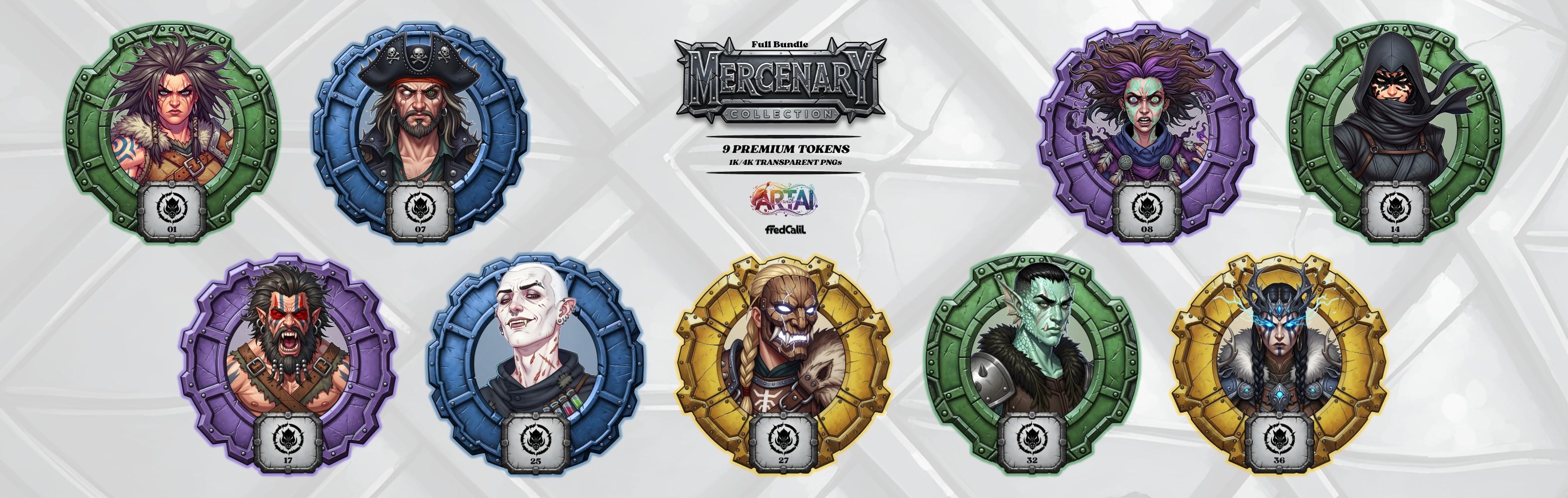 All four volumes of the Mercenary Collection are now united in one bundle! Get 36 premium RPG tokens in 1K and 4K PNG, ready for Roll20, Foundry, and more β with 25% off.