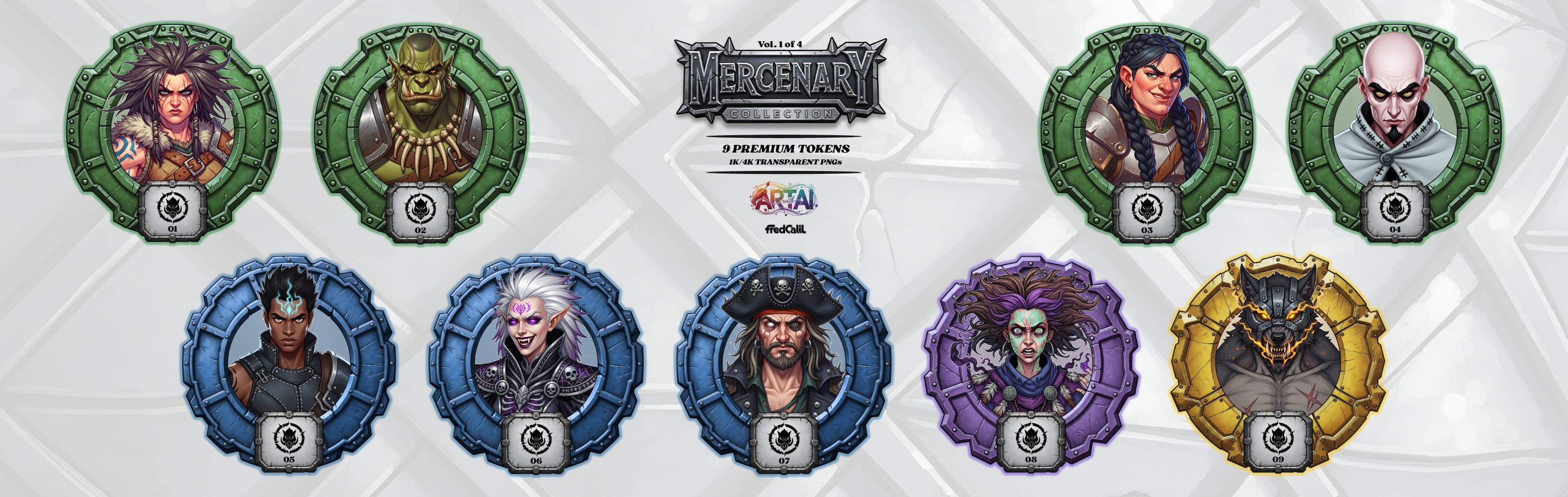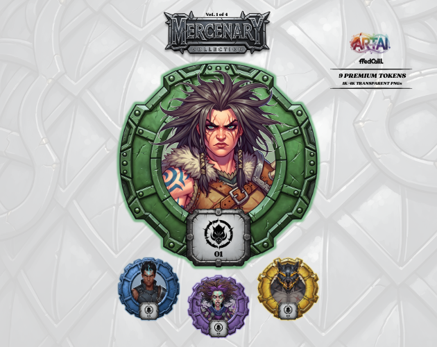 A Mercenary Collection – Vol. 1 (Gratuito) já está disponível! Comece sua jornada no universo Art with AI com 9 tokens premium de RPG, criados no estilo Chiaroscuro Fantasy. Todos os tokens vêm em PNG transparente 1K e 4K, prontos para Roll20, Foundry e outras plataformas VTT.