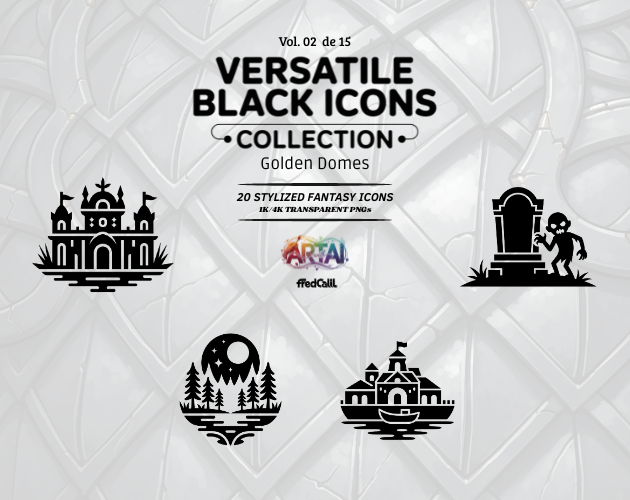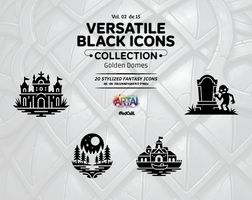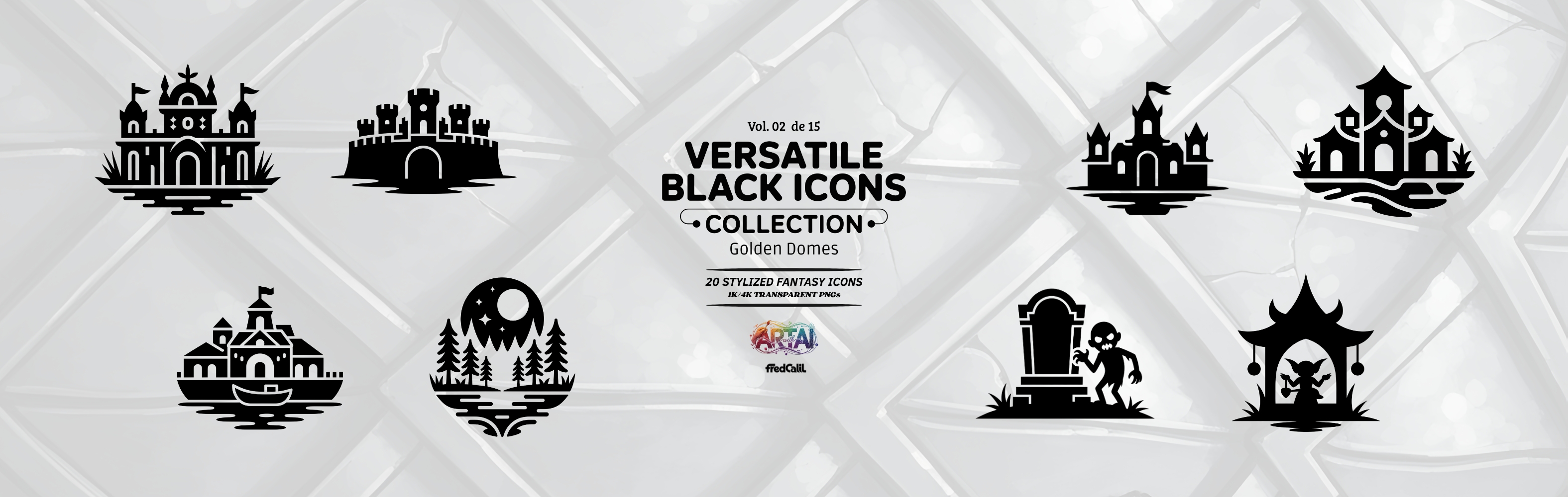 Today we launch Volume V02: Golden Domes of the Versatile Black Icons series. In this pack, you’ll find 20 refined black fantasy icons representing sacred empires, palatial domes and ritual courts. These are designed for creators who demand high clarity, narrative strength and design consistency.