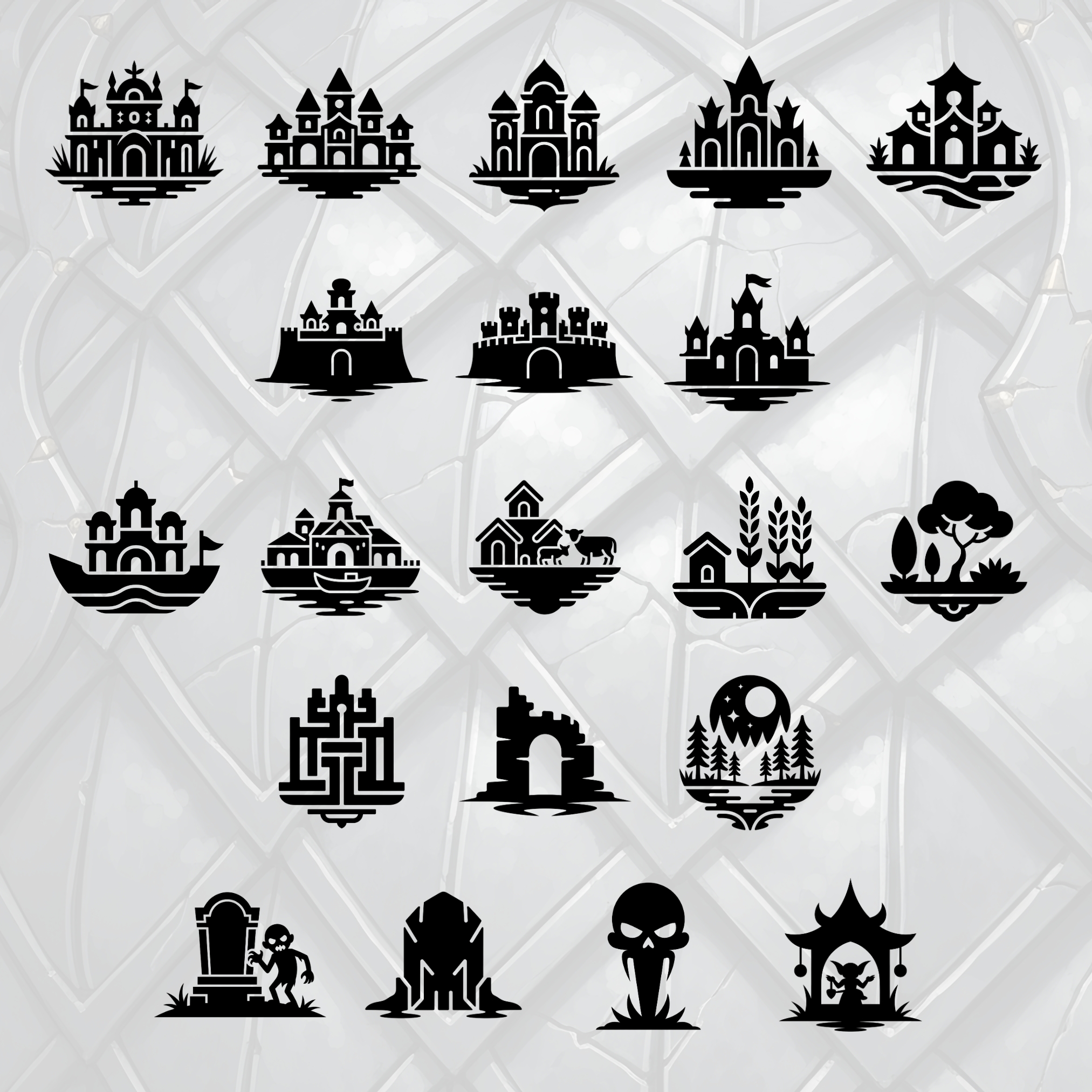 | Tags | Black and White, Fantasy, game-assets, Icons, map-icons, printable, silhouette, transparent-png, worldbuilding |